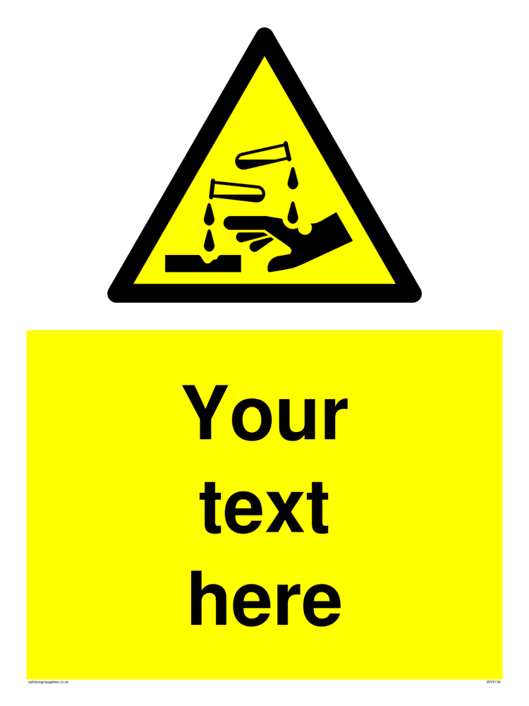 This sign contains an international standard corrosive warning symbol. Bar and hand damaged by substance dripping from test tubes in black on a yellow warning triangle with black border.