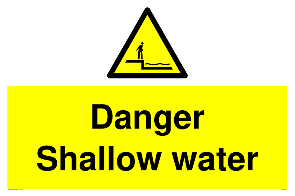 This sign contains a shallow water warning symbol. Person standing next to drop into shallow water in black on yellow warning triangle with black border.