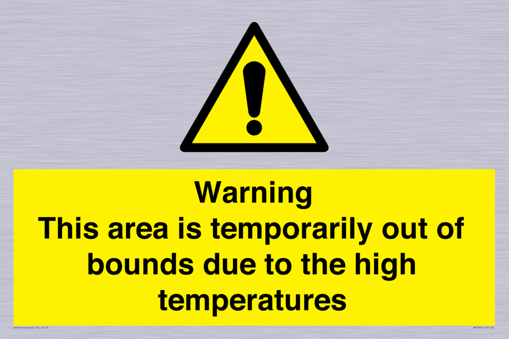 Sign Text: Warning This area is temporarily out of bounds due to the high temperatures Product Type: Warning Safety Signs Dimensions: 600x400mm Material: Brushed silver aluminum with 2 channel Orientation: Landscape Text Colour: White More...
