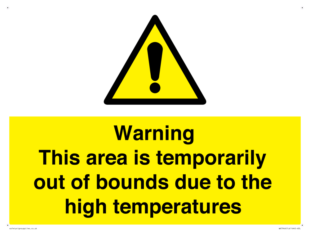Sign Text: Warning This area is temporarily out of bounds due to the high temperatures