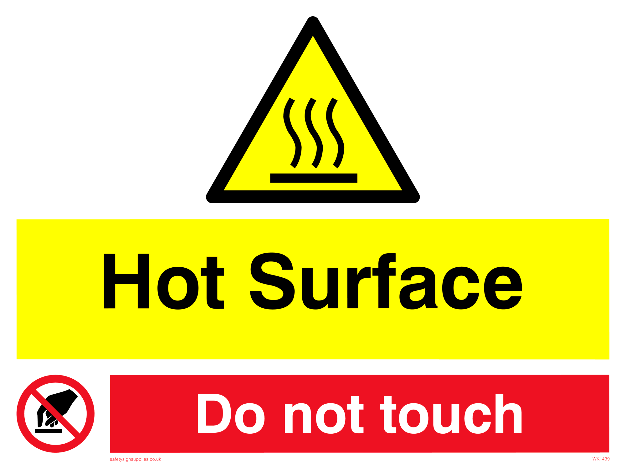 This sign contains a high temperature warning symbol. Wavy lines in black on yellow warning triangle with black border.