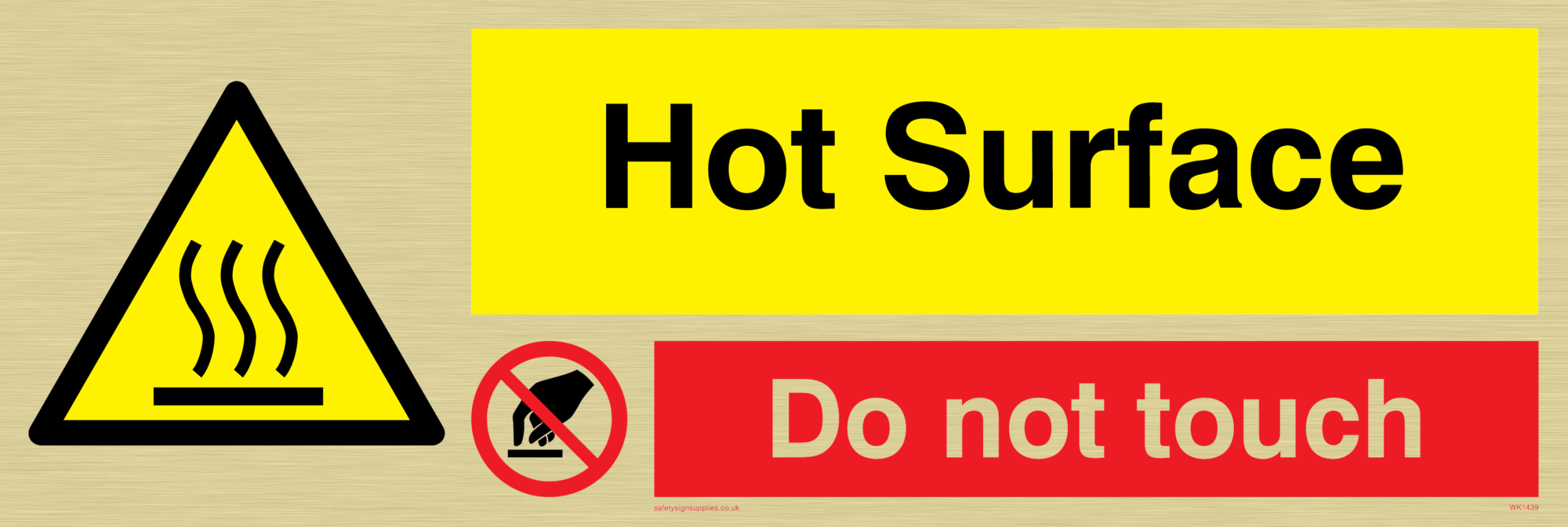 This sign contains a high temperature warning symbol. Wavy lines in black on yellow warning triangle with black border.