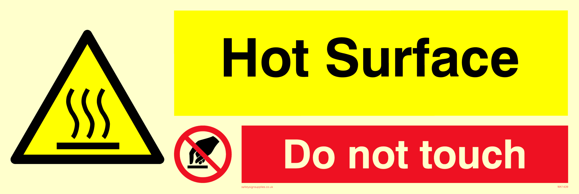 This sign contains a high temperature warning symbol. Wavy lines in black on yellow warning triangle with black border.