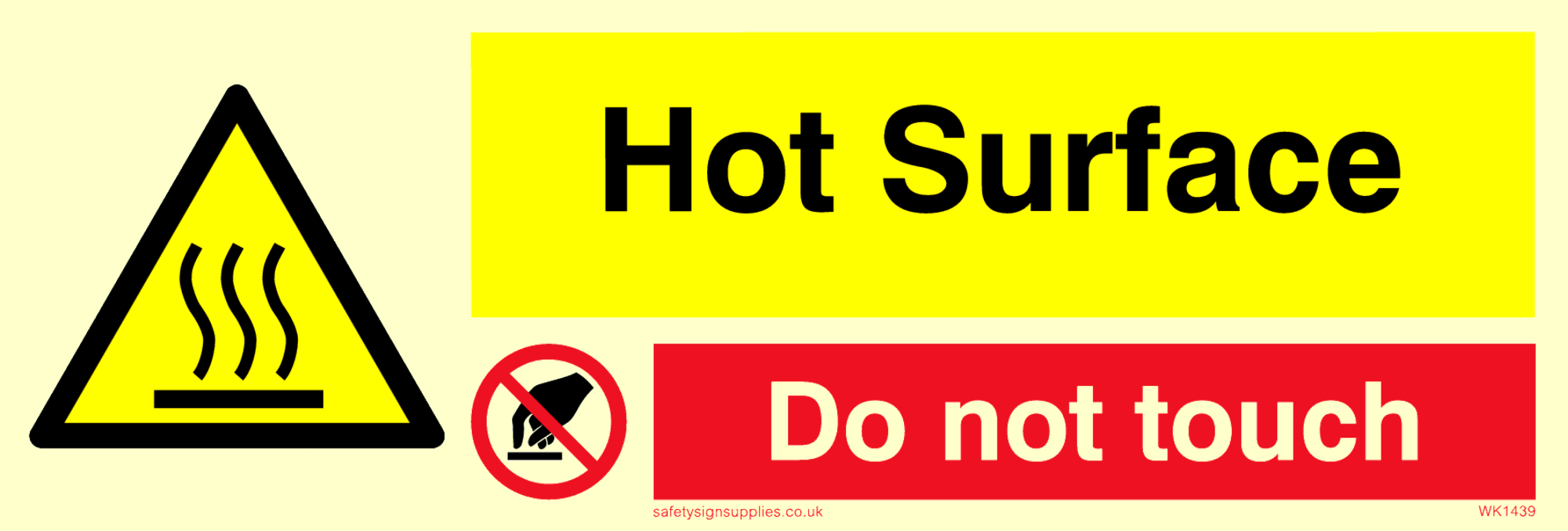 This sign contains a high temperature warning symbol. Wavy lines in black on yellow warning triangle with black border.