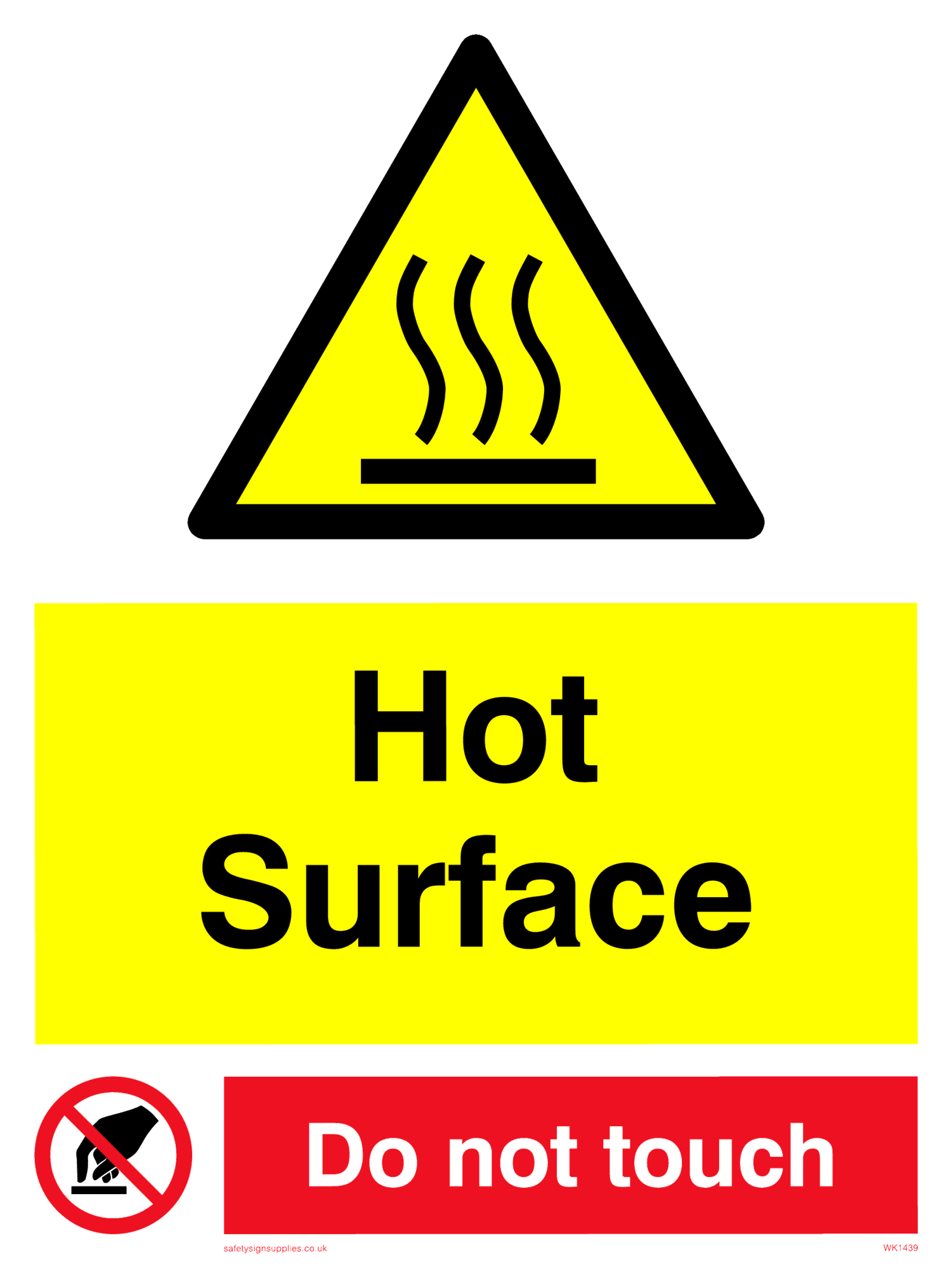 This sign contains a high temperature warning symbol. Wavy lines in black on yellow warning triangle with black border.