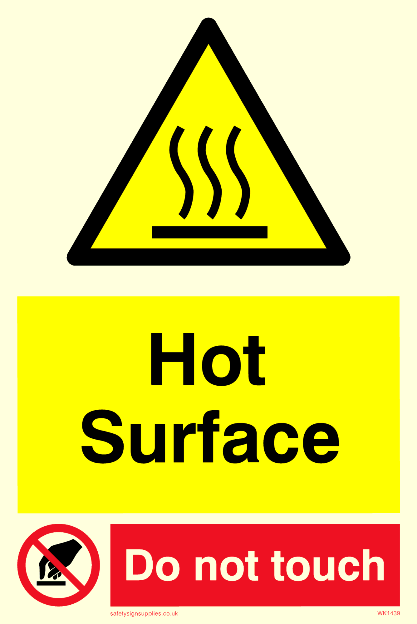 This sign contains a high temperature warning symbol. Wavy lines in black on yellow warning triangle with black border.