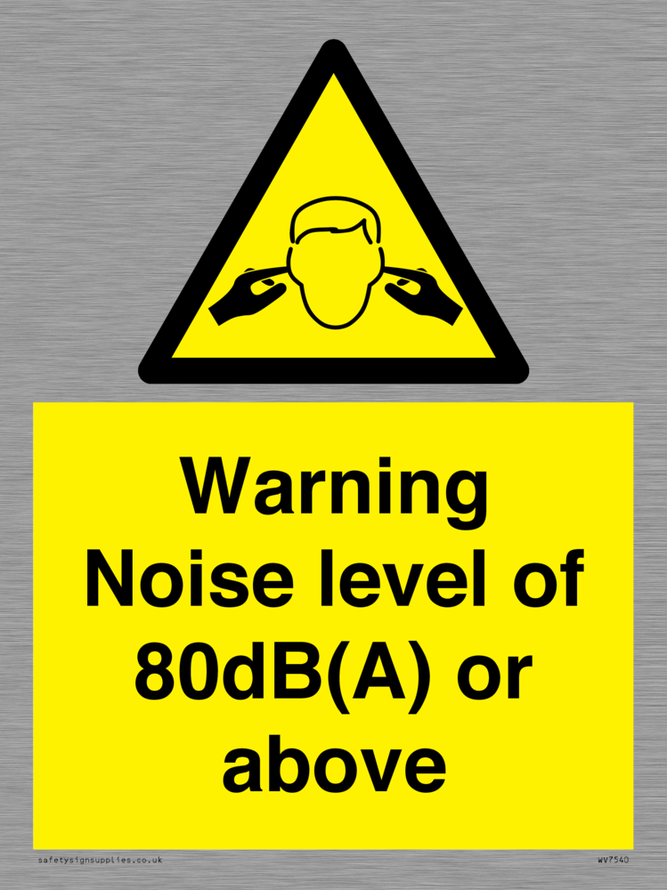 This sign contains a standard noise hazard symbol. Person with fingers in their ears in black on yellow warning triangle with black border.