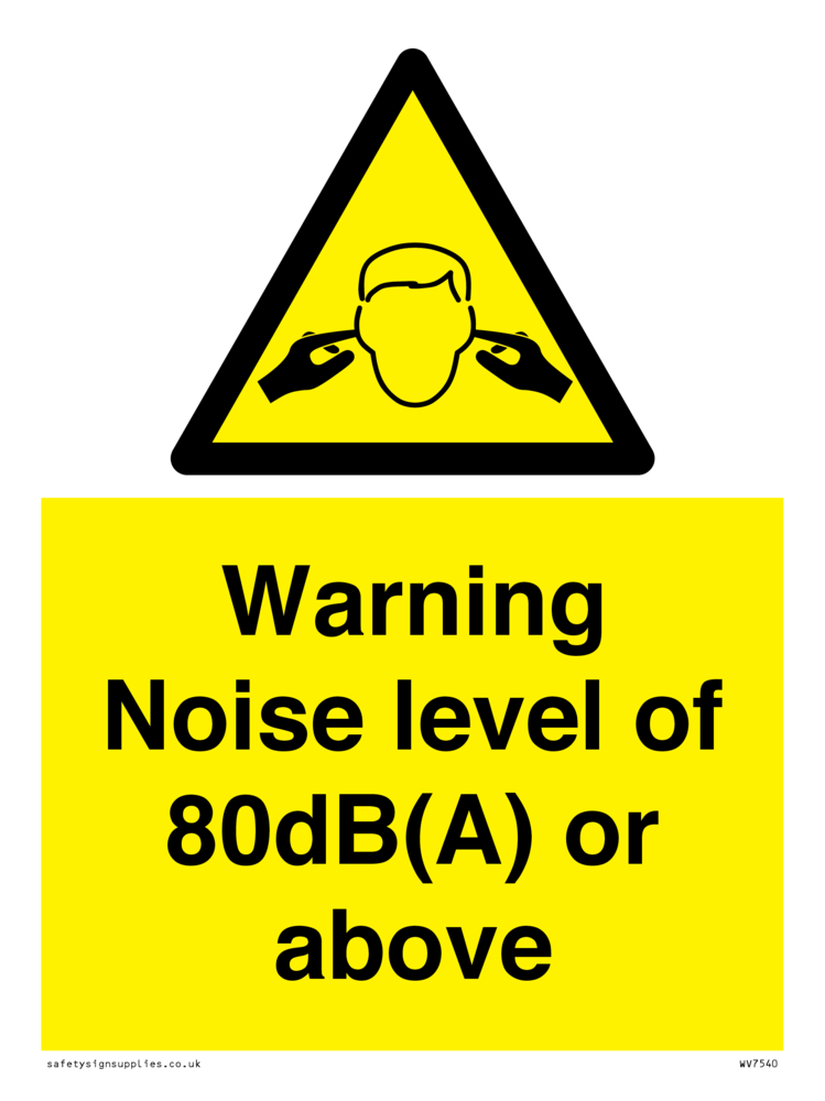 This sign contains a standard noise hazard symbol. Person with fingers in their ears in black on yellow warning triangle with black border.