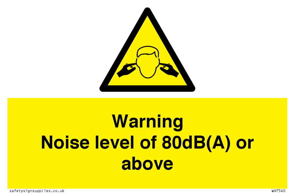 This sign contains a standard noise hazard symbol. Person with fingers in their ears in black on yellow warning triangle with black border.
