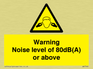 This sign contains a standard noise hazard symbol. Person with fingers in their ears in black on yellow warning triangle with black border.