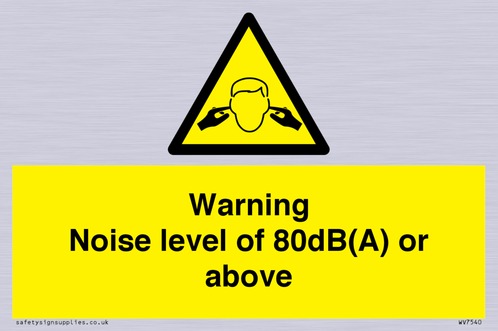 This sign contains a standard noise hazard symbol. Person with fingers in their ears in black on yellow warning triangle with black border.