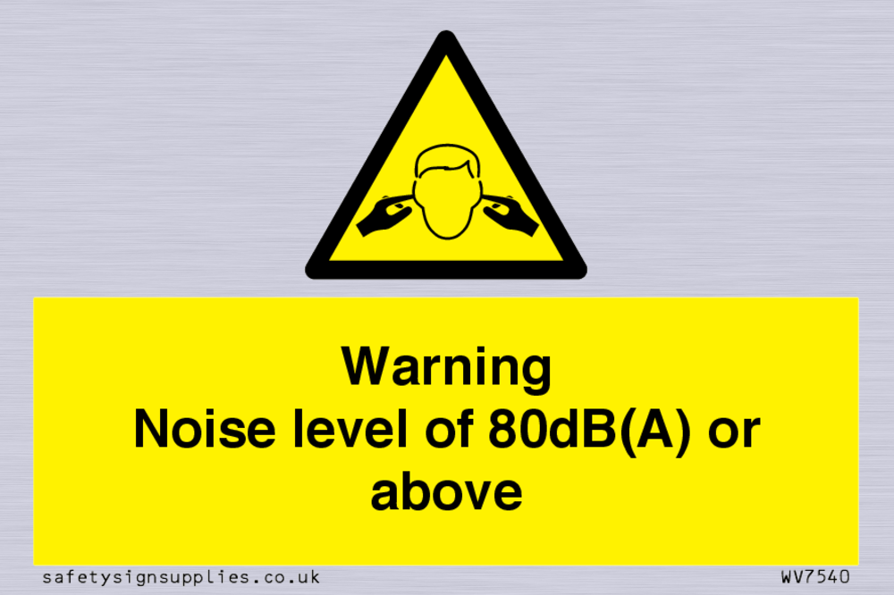 This sign contains a standard noise hazard symbol. Person with fingers in their ears in black on yellow warning triangle with black border.