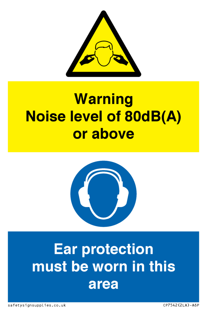 Sign Text: Warning Noise level of 80dB(A) or above. Ear protection must be worn in this area