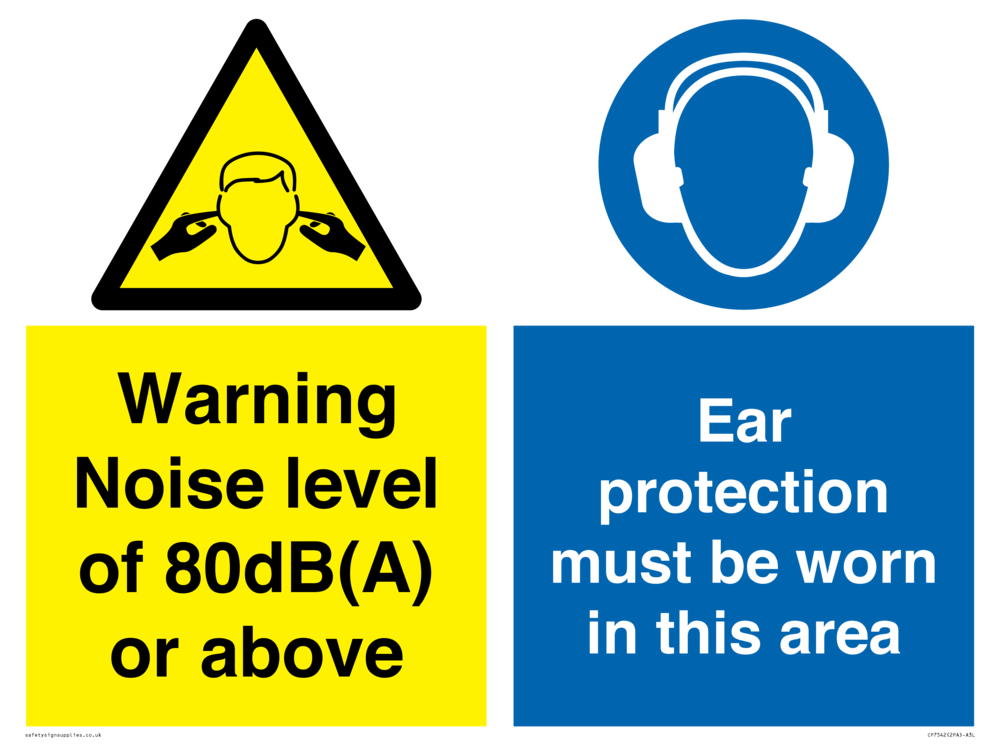 Sign Text: Warning Noise level of 80dB(A) or above. Ear protection must be worn in this area
