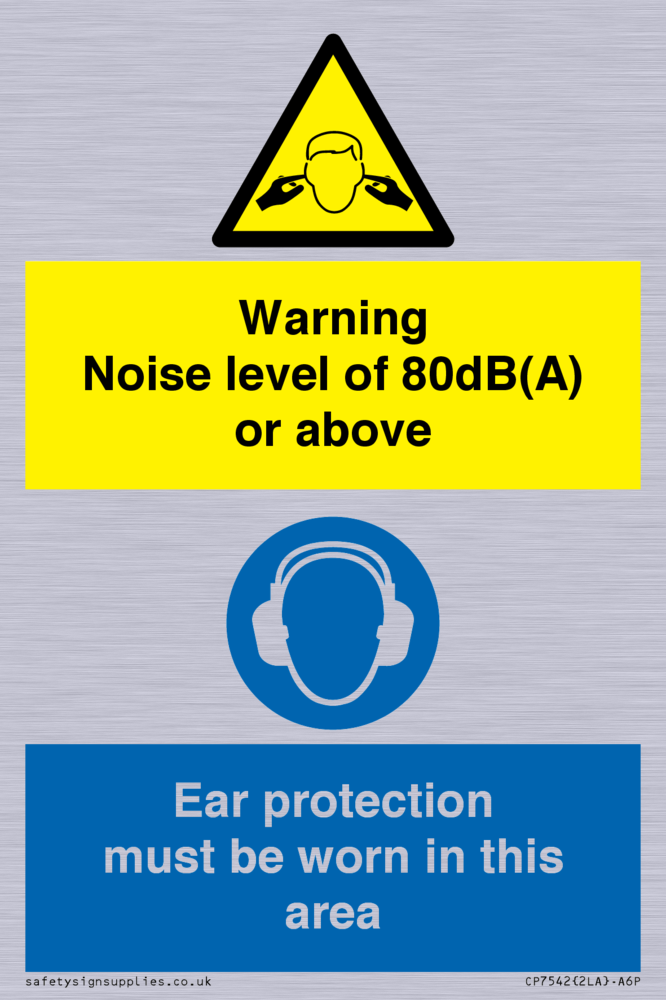 Sign Text: Warning Noise level of 80dB(A) or above. Ear protection must be worn in this area