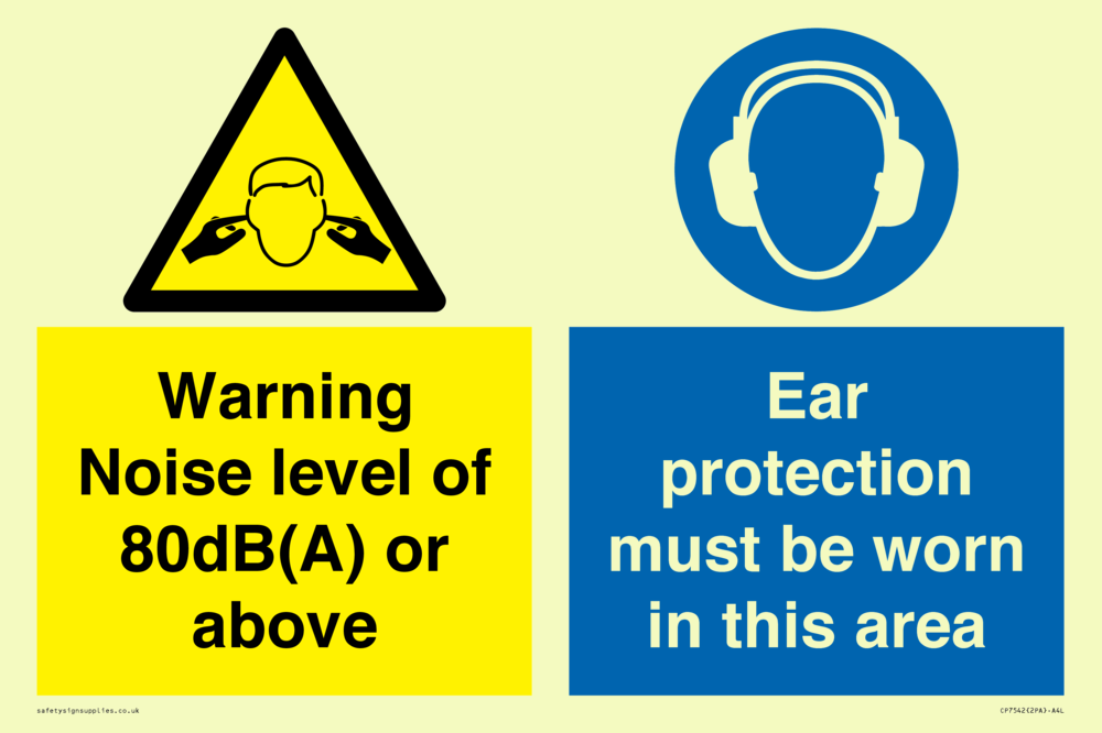 Sign Text: Warning Noise level of 80dB(A) or above. Ear protection must be worn in this area