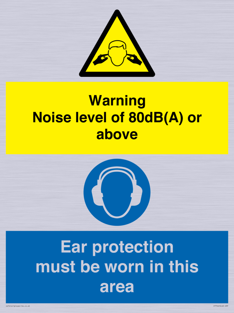 Sign Text: Warning Noise level of 80dB(A) or above. Ear protection must be worn in this area