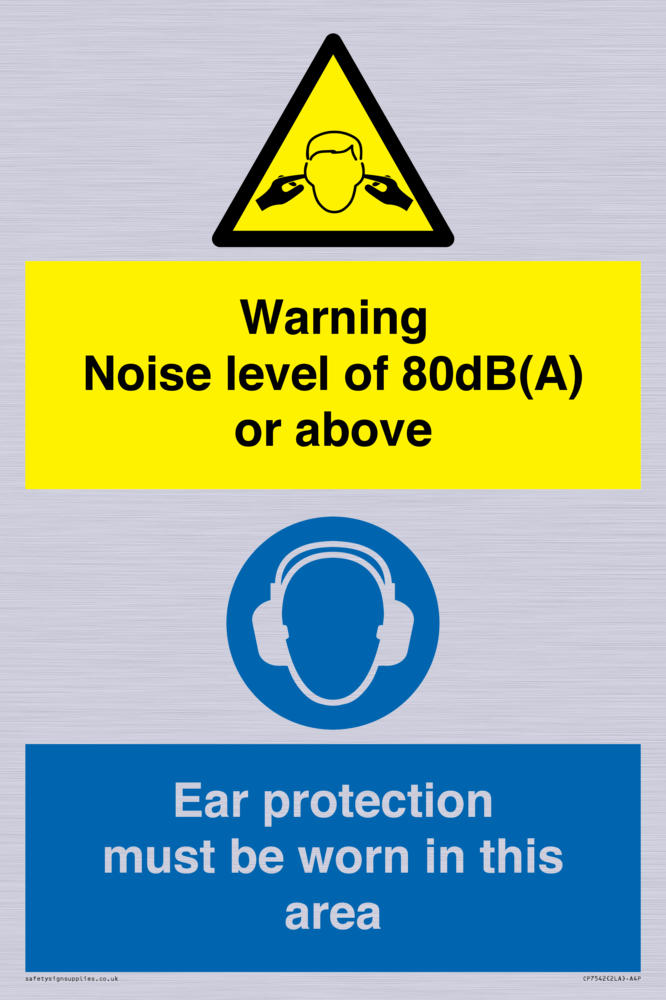 Sign Text: Warning Noise level of 80dB(A) or above. Ear protection must be worn in this area