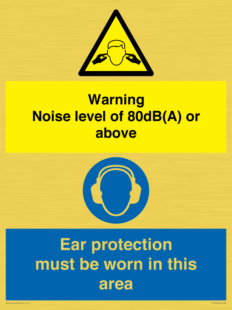 Sign Text: Warning Noise level of 80dB(A) or above. Ear protection must be worn in this area