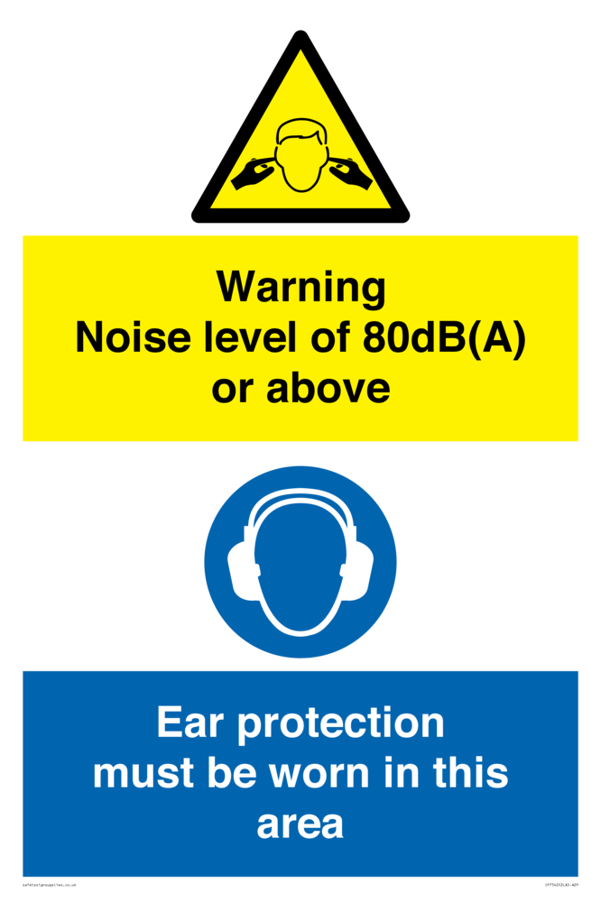 Sign Text: Warning Noise level of 80dB(A) or above. Ear protection must be worn in this area