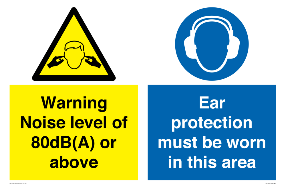 Sign Text: Warning Noise level of 80dB(A) or above. Ear protection must be worn in this area