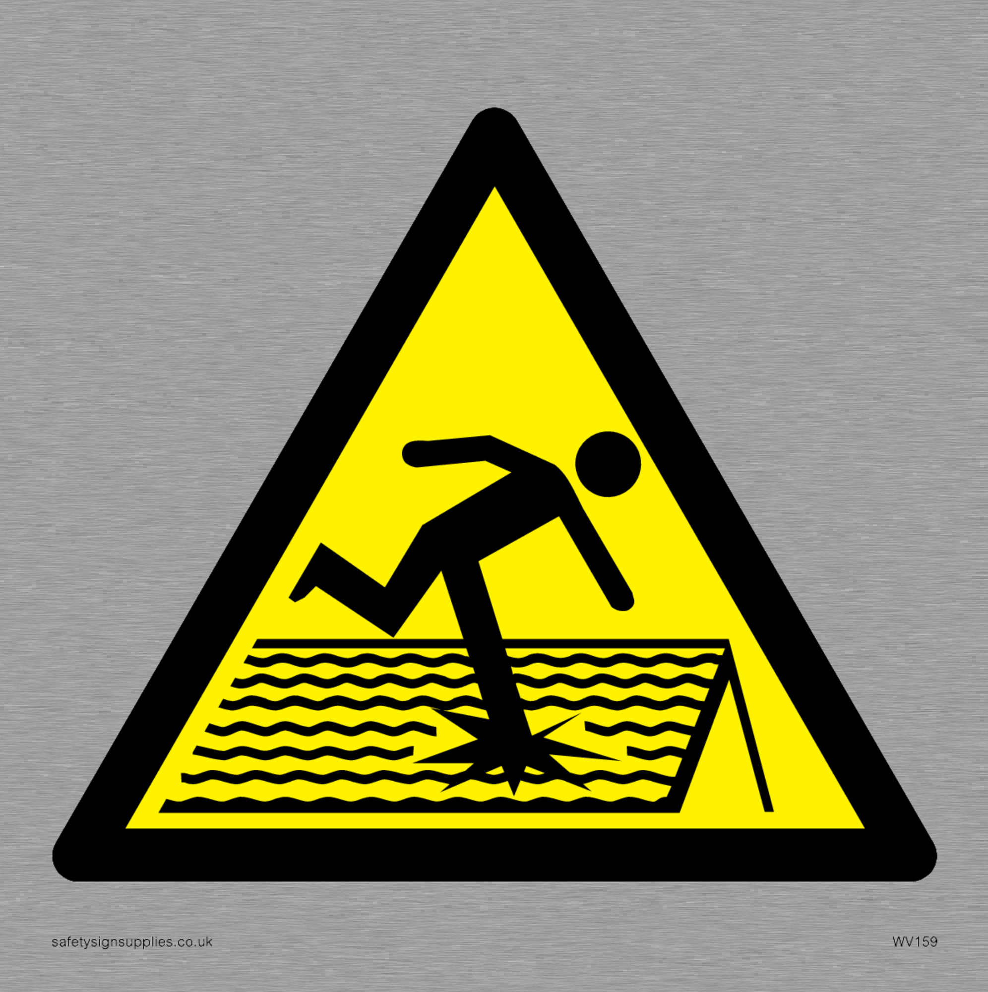 The background of this sign is the colour of the base material. This sign contains a fragile roof warning symbol. Person tripping / walking on damaged roof in black on yellow warning triangle with border in black.