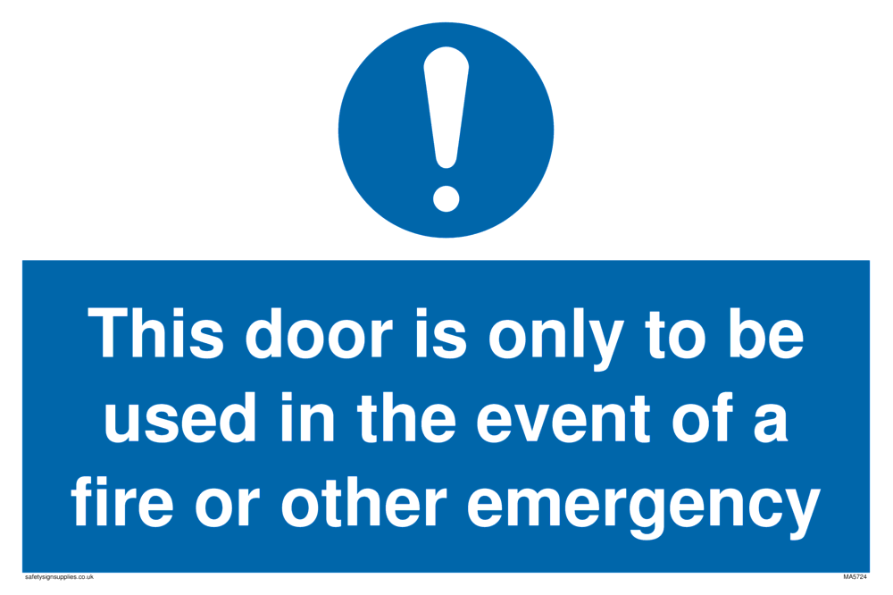 Fire exit signs or Emergency exit signs indicate the direction of the exit in the event of a fire or emergency requiring evacuation of a building. Fire door signs are used on a fire door or emergency door to indicate conditions of use. Fire escape signs give information relating to fire escape locations or modes of use.