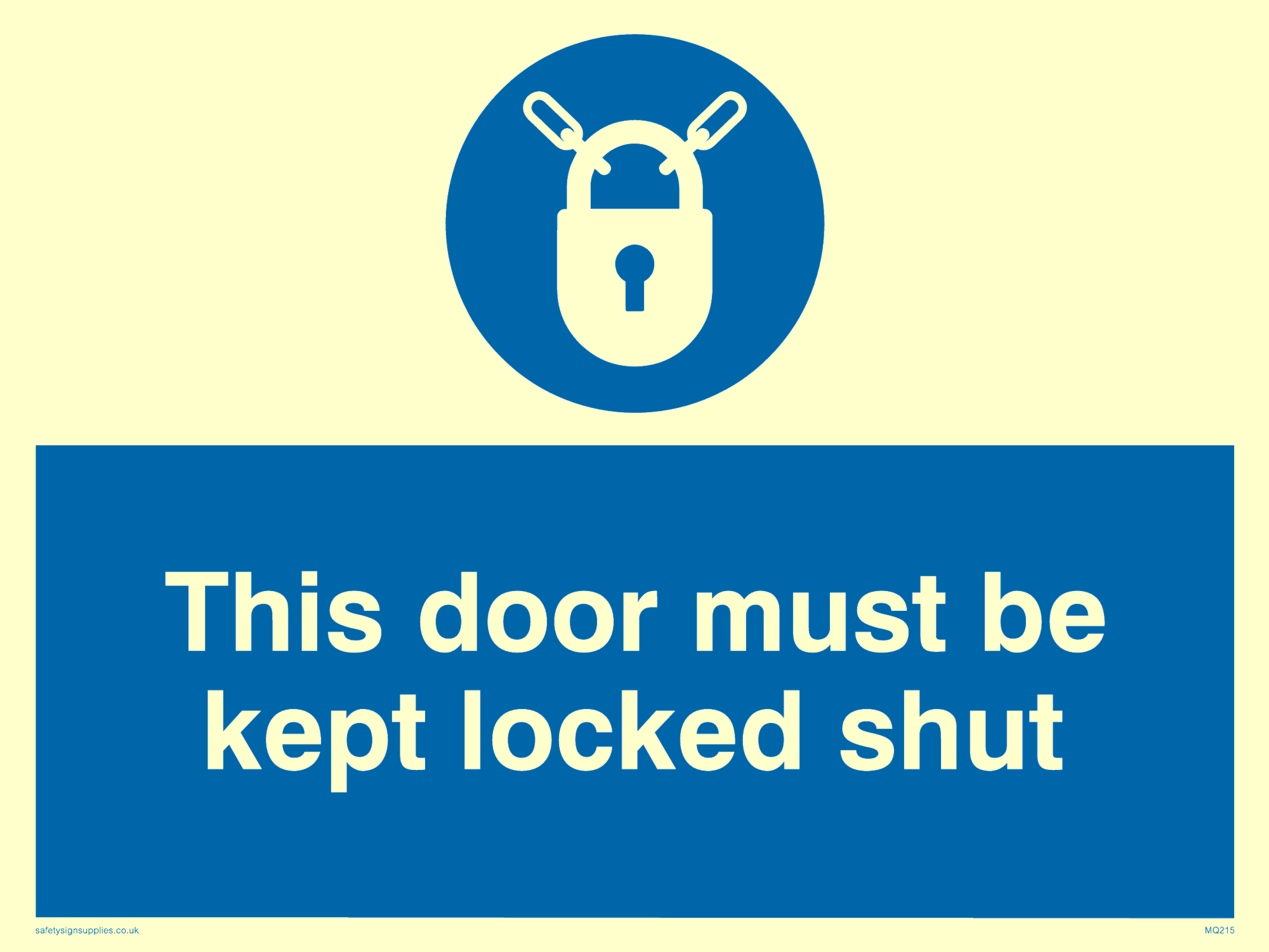 This sign contains a lock required symbol. Padlock in white within a blue circle. Comes with a self adhesive backing.