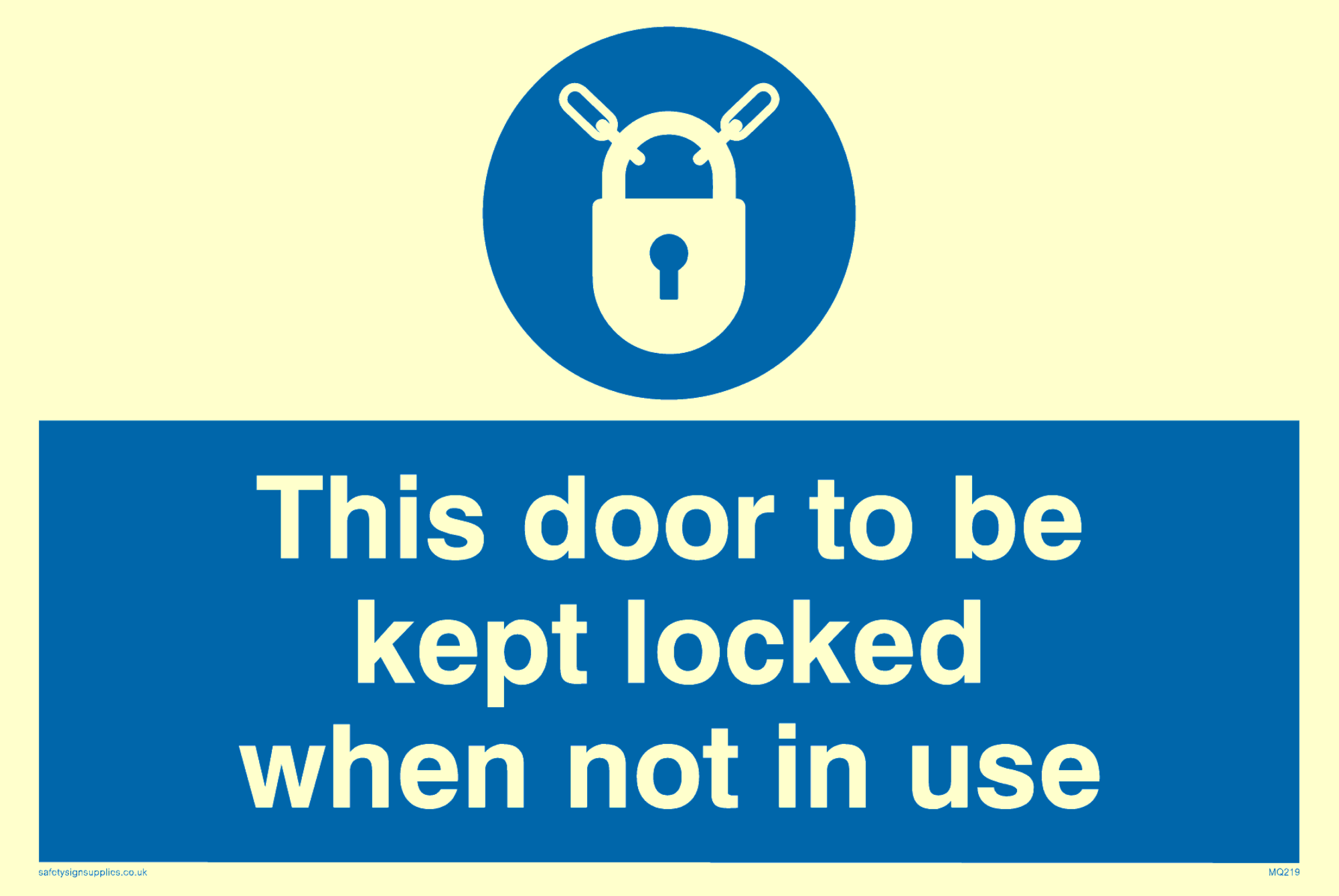 This sign contains a lock required symbol. Padlock in white within a blue circle. Comes with a self adhesive backing.
