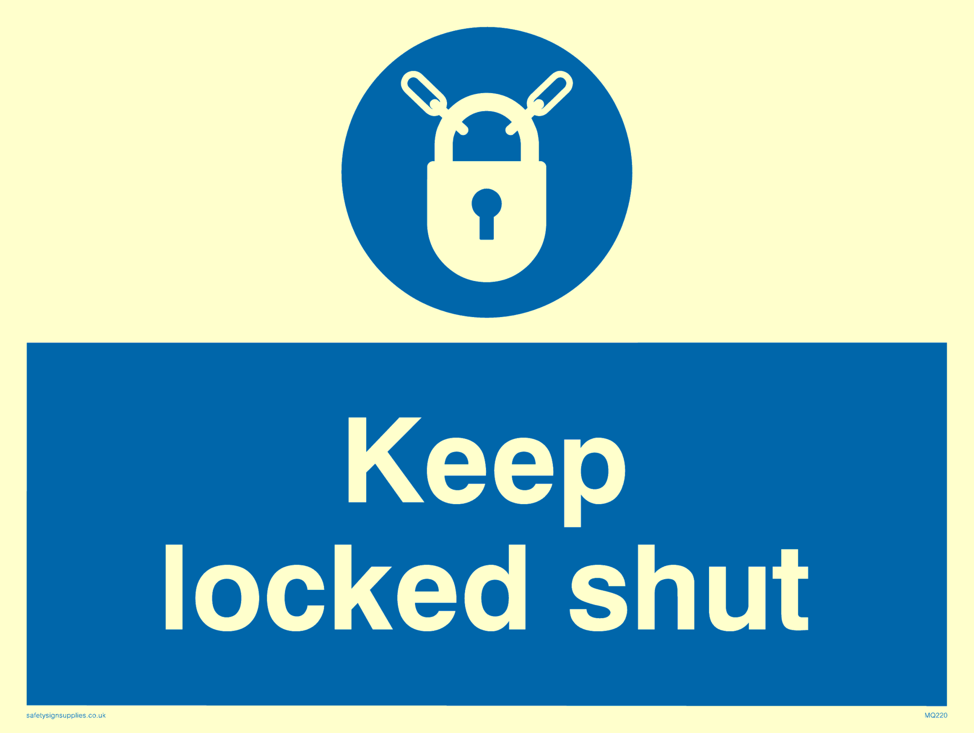 This sign contains a lock required symbol. Padlock in white within a blue circle. Comes with a self adhesive backing.