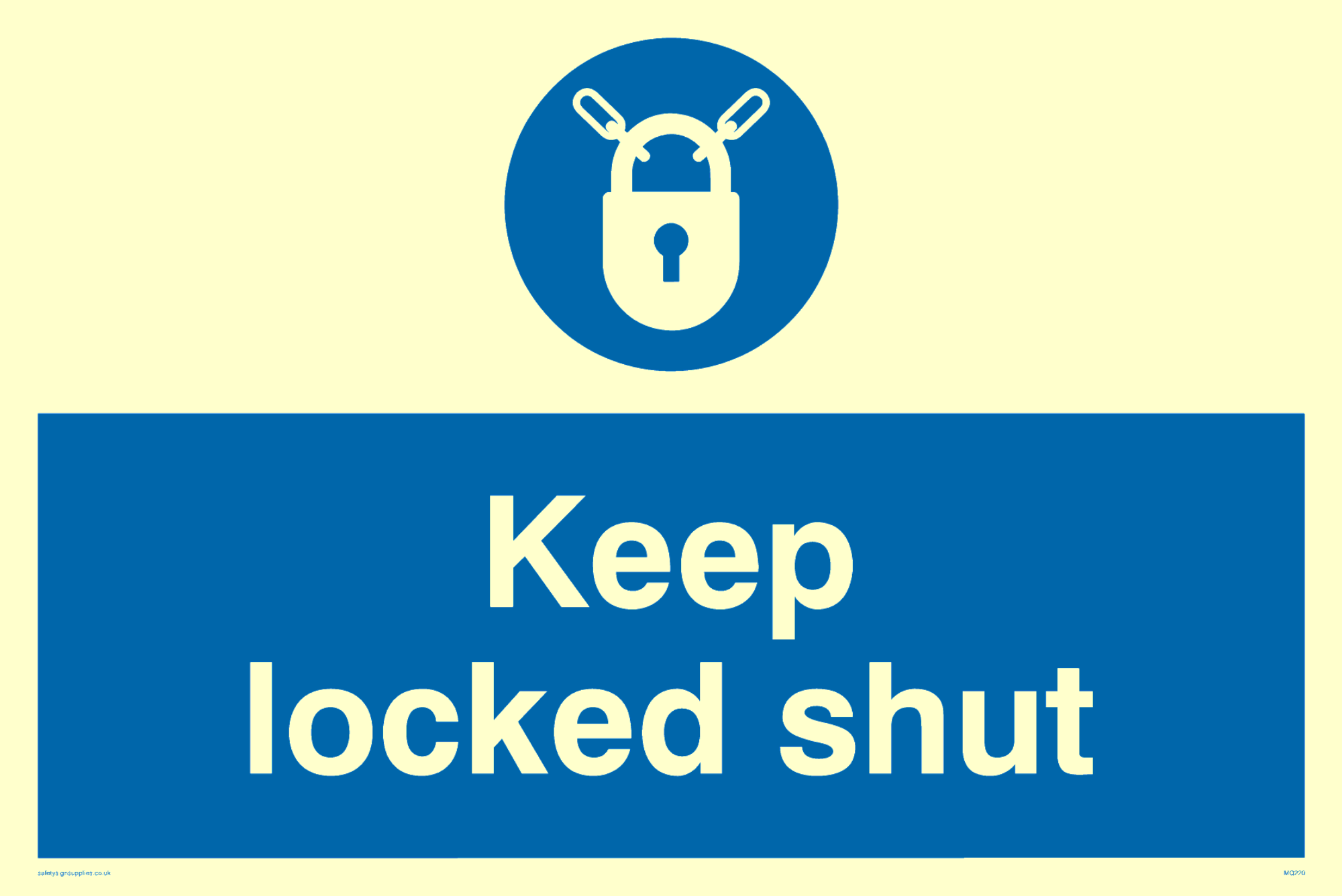 This sign contains a lock required symbol. Padlock in white within a blue circle.
