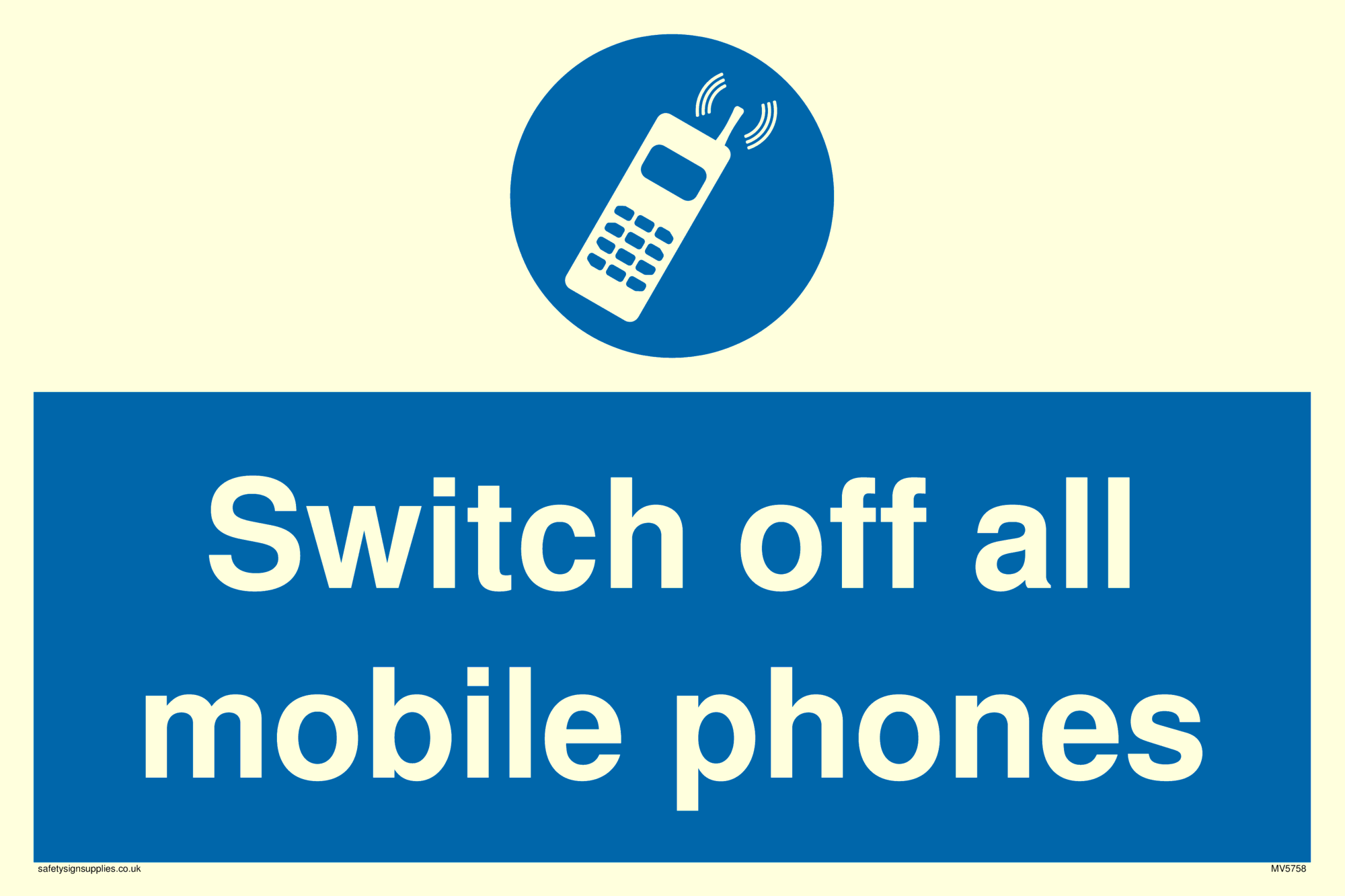 This sign shows a mandatory mobile sign. It shows a mobile phone symbol and is used in signs were you want to give people a specific instruction regarding their mobile phone. For Example if mobile phones must be switched off or switched to silent/airplane mode.