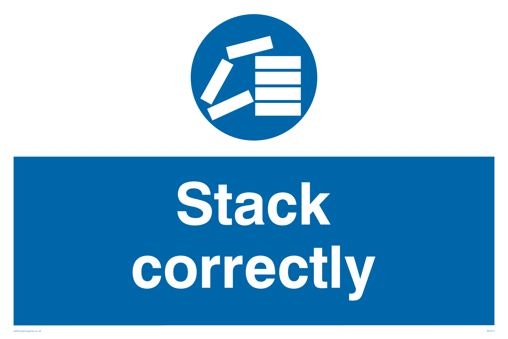 This sign contains a stack correctly symbol - pile of stacked boxes with one falling off the top in white on blue circle.