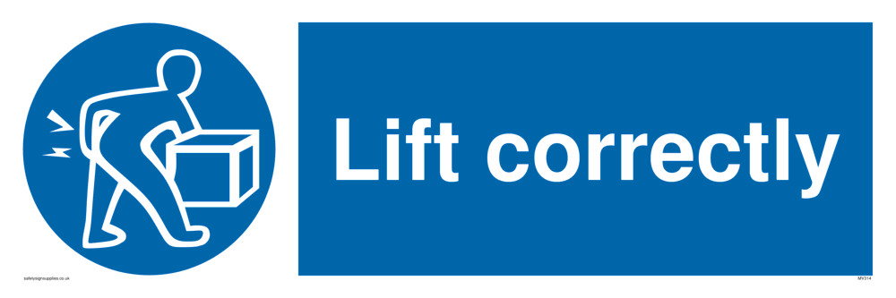 This sign contains a lift correctly / manual handling symbol - person lifting a heavy box in white within blue circle.