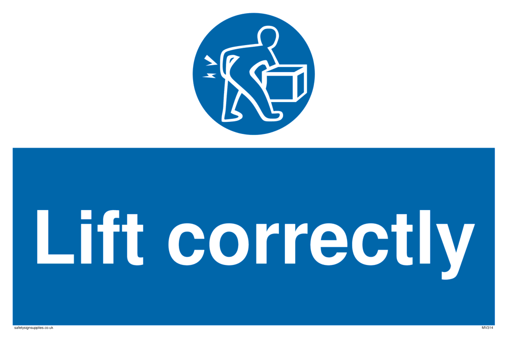 This sign contains a lift correctly / manual handling symbol - person lifting a heavy box in white within blue circle.