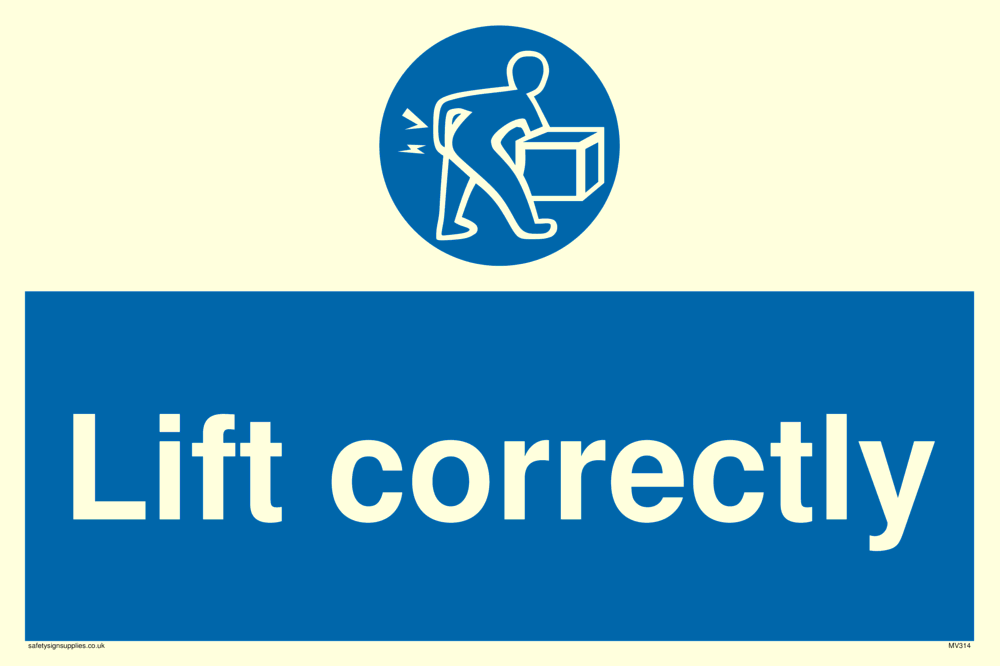 This sign contains a lift correctly / manual handling symbol - person lifting a heavy box in white within blue circle. Comes with a self adhesive backing.