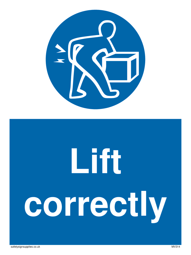 This sign contains a lift correctly / manual handling symbol - person lifting a heavy box in white within blue circle. Comes with a self adhesive backing.