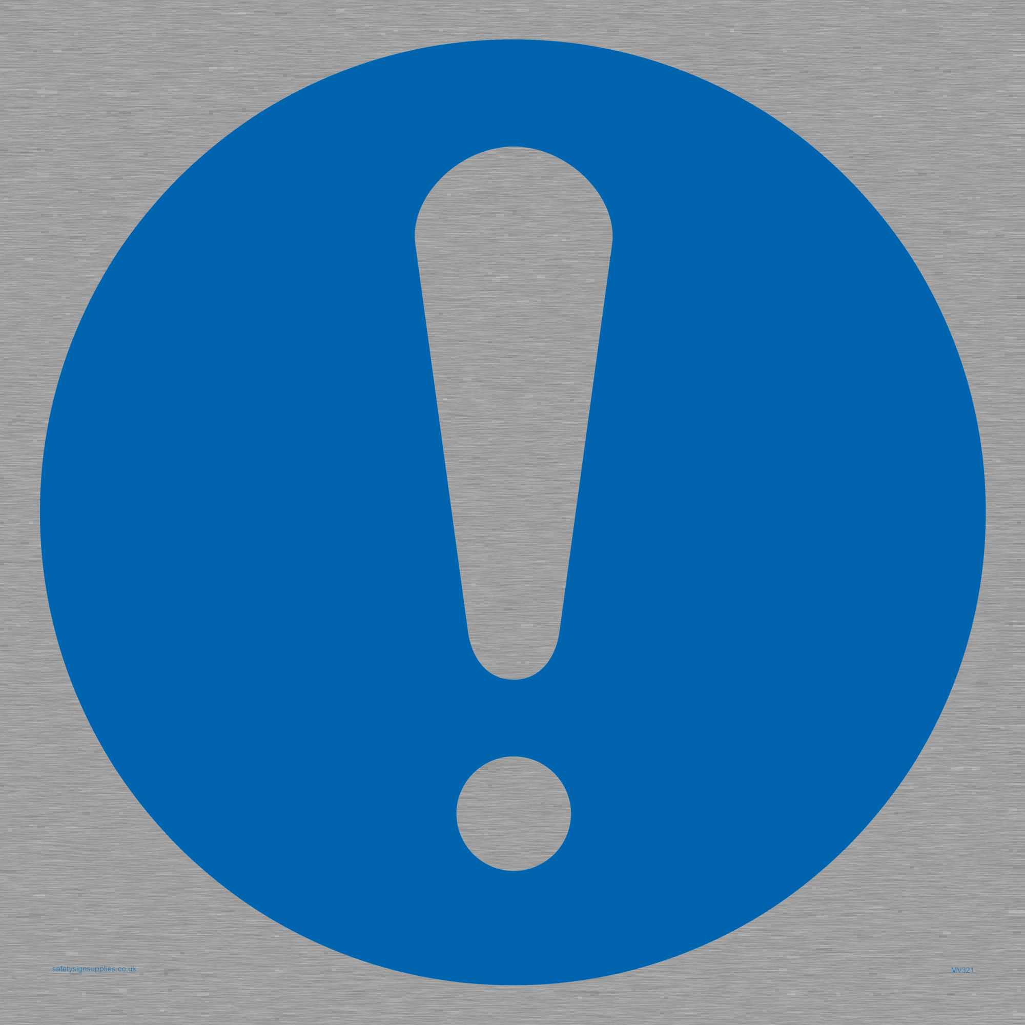 This sign contains a general Mandatory Exclamation Symbol - exclamation mark in white on blue circle background.