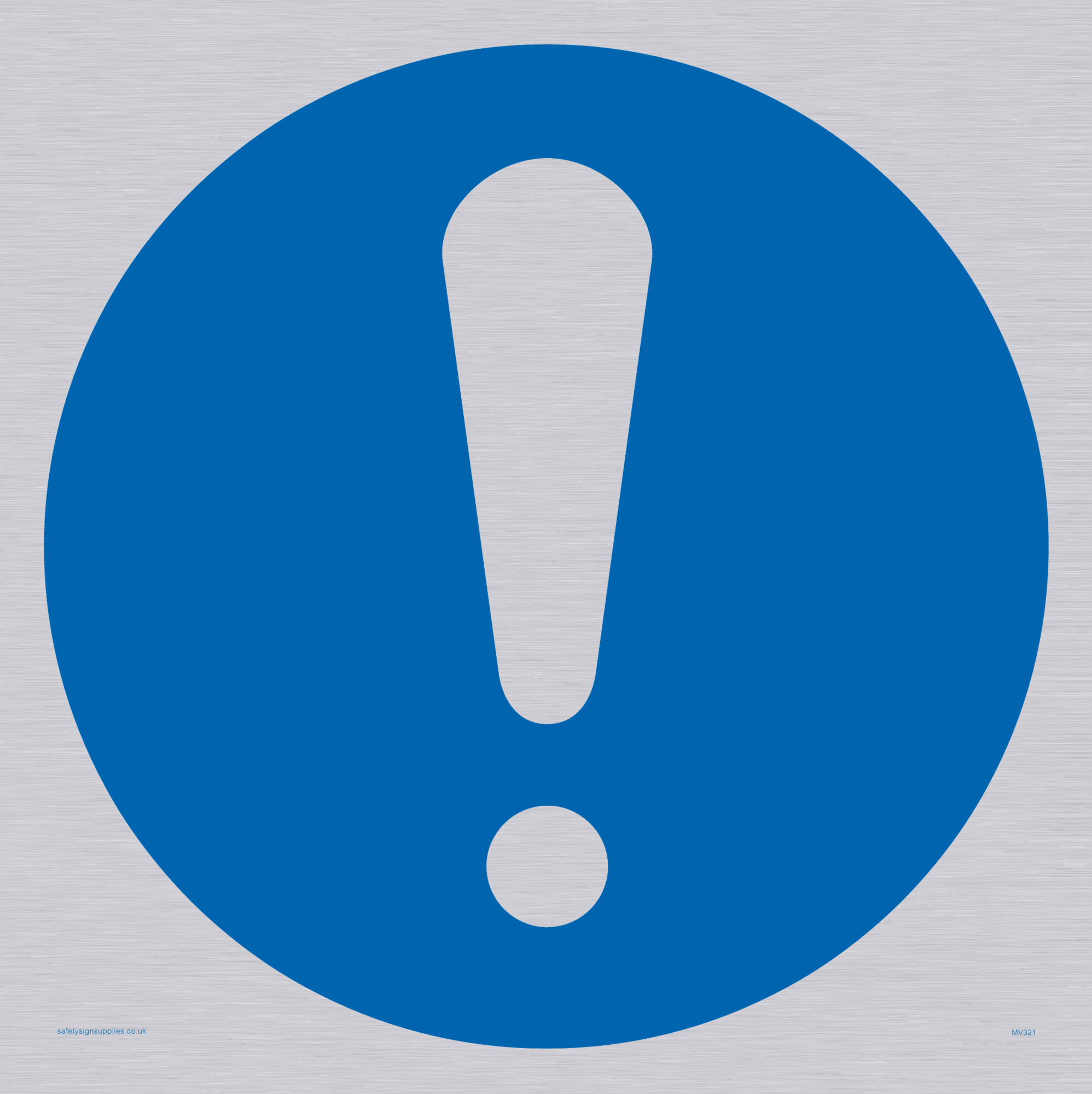 This sign contains a general Mandatory Exclamation Symbol - exclamation mark in white on blue circle background.