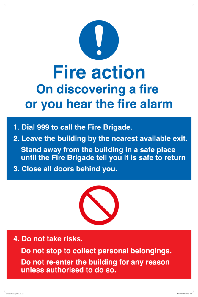 Fire action On discovering a fire or you hear the fire alarm 1. Dial 999 to call the Fire Brigade. 2. Leave the building by the nearest available exit. Stand away from the building in a safe place until the Fire Brigade tell you it is safe to return 3. Close all doors behind you. 4. Do not take risks. Do not stop to collect personal belongings. Do not re-enter the building for any reason unless authorised to do so.