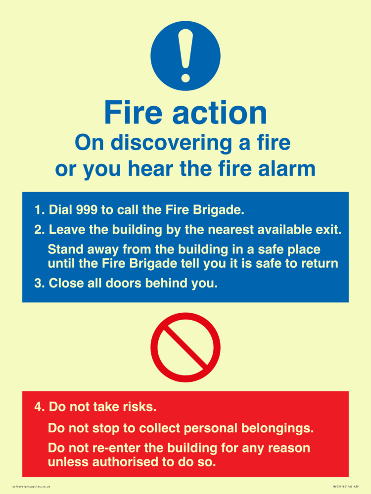 Fire action On discovering a fire or you hear the fire alarm 1. Dial 999 to call the Fire Brigade. 2. Leave the building by the nearest available exit. Stand away from the building in a safe place until the Fire Brigade tell you it is safe to return 3. Close all doors behind you. 4. Do not take risks. Do not stop to collect personal belongings. Do not re-enter the building for any reason unless authorised to do so.