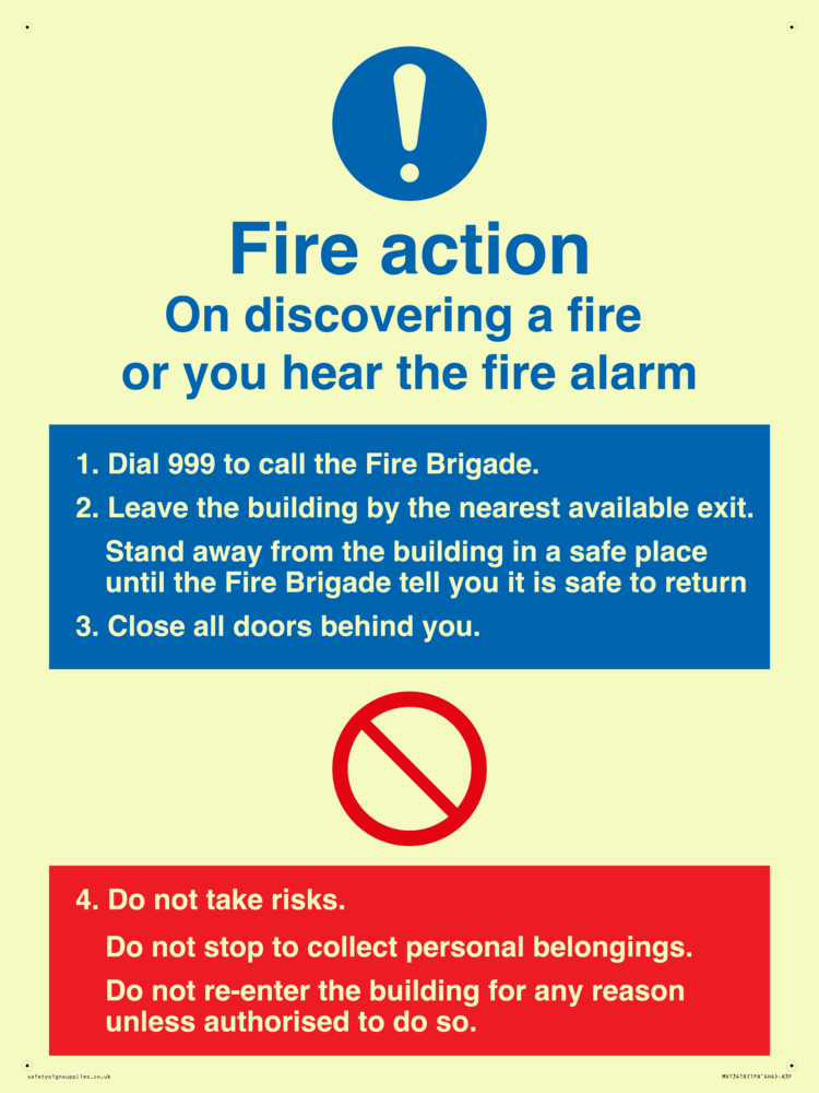 Fire action On discovering a fire or you hear the fire alarm 1. Dial 999 to call the Fire Brigade. 2. Leave the building by the nearest available exit. Stand away from the building in a safe place until the Fire Brigade tell you it is safe to return 3. Close all doors behind you. 4. Do not take risks. Do not stop to collect personal belongings. Do not re-enter the building for any reason unless authorised to do so.