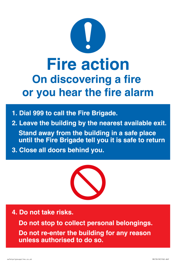 Fire action On discovering a fire or you hear the fire alarm 1. Dial 999 to call the Fire Brigade. 2. Leave the building by the nearest available exit. Stand away from the building in a safe place until the Fire Brigade tell you it is safe to return 3. Close all doors behind you. 4. Do not take risks. Do not stop to collect personal belongings. Do not re-enter the building for any reason unless authorised to do so.