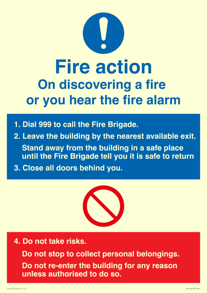 Fire action On discovering a fire or you hear the fire alarm 1. Dial 999 to call the Fire Brigade. 2. Leave the building by the nearest available exit. Stand away from the building in a safe place until the Fire Brigade tell you it is safe to return 3. Close all doors behind you. 4. Do not take risks. Do not stop to collect personal belongings. Do not re-enter the building for any reason unless authorised to do so.