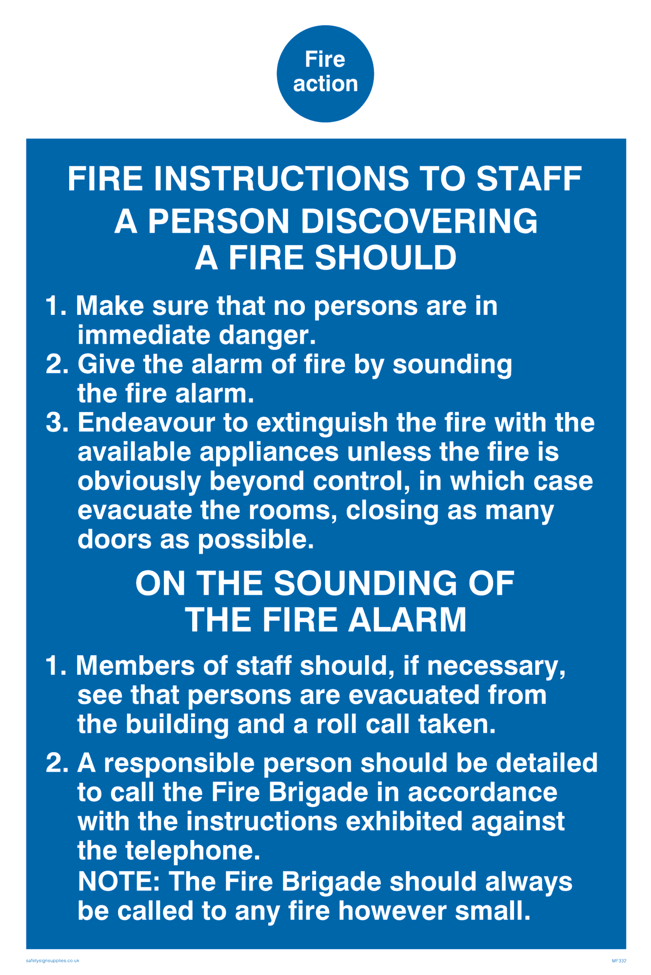 This sign contains a fire action required symbol - fire action in white within blue circle.