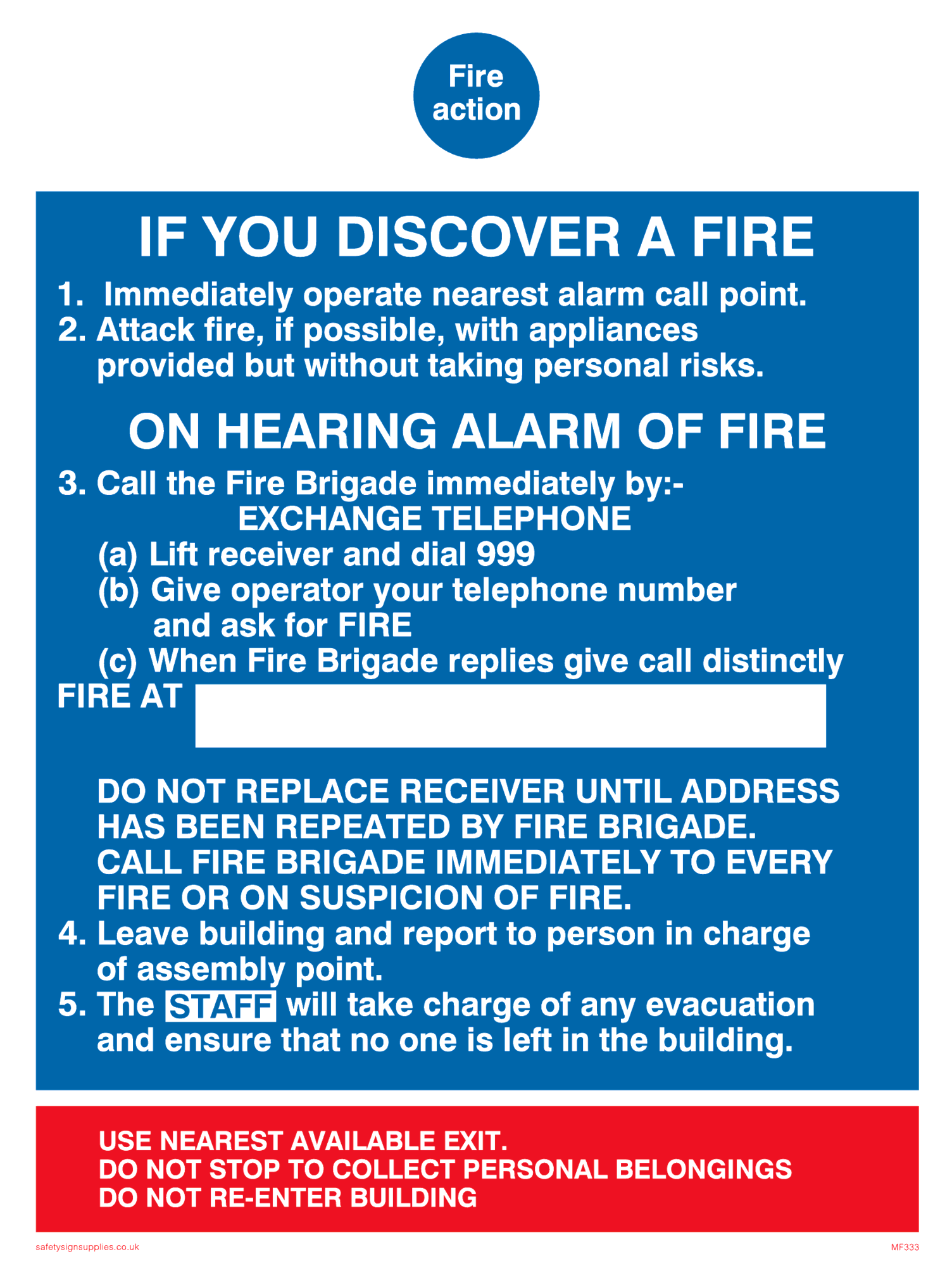 Sign Text: Fire action IF YOU DISCOVER A FIRE 1. Immediately operate nearest alarm call point. 2. Attack fire, if possible, with appliances provided but without taking personal risks ON HEARING ALARM OF FIRE 3. Call the Fire Brigade immediately by:- EXCHANGE TELEPHONE (a) Lift receiver and dial 999 (b) Give operator your telephone number and ask for FIRE (c) When Fire Brigade replies give call distinctly FIRE AT DO NOT REPLACE RECEIVER UNTIL ADDRESS HAS BEEN REPEATED BY FIRE BRIGADE. CALL FIRE BRIGADE IMMEDIATELY TO EVERY FIRE OR ON SUSPICION OF FIRE. 4. Leave building and report to person in charge of assembly point. 5. The STAFF will take charge of any evacuation and ensure that no one is left in the building. USE NEAREST AVAILABLE EXIT.