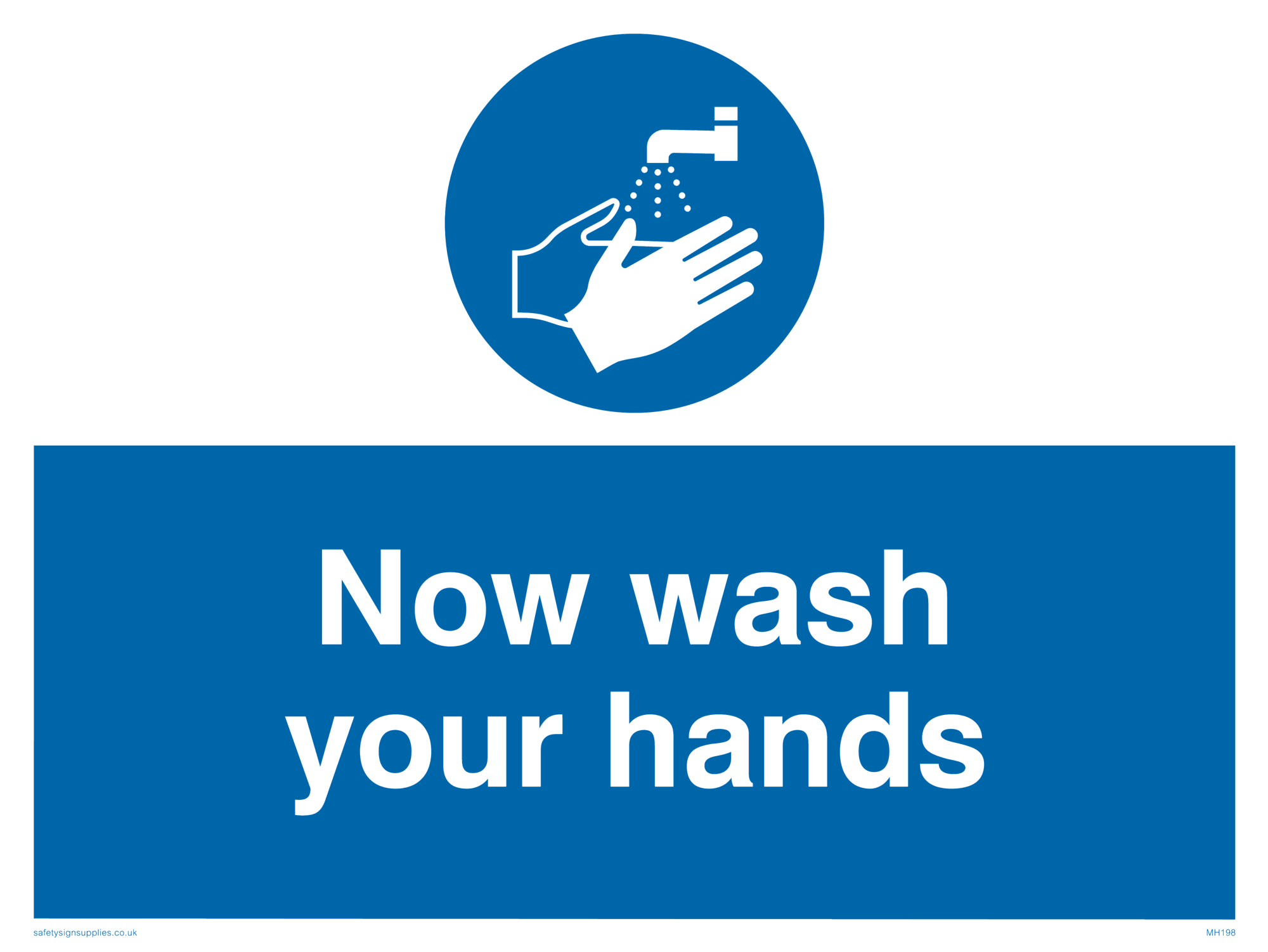 This sign contains a wash hands symbol - person washing hands under running tap in white within blue circle.