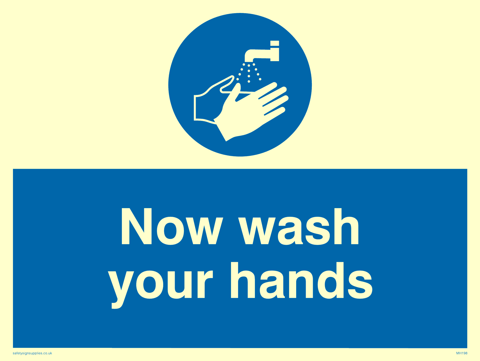 This sign contains a wash hands symbol - person washing hands under running tap in white within blue circle.