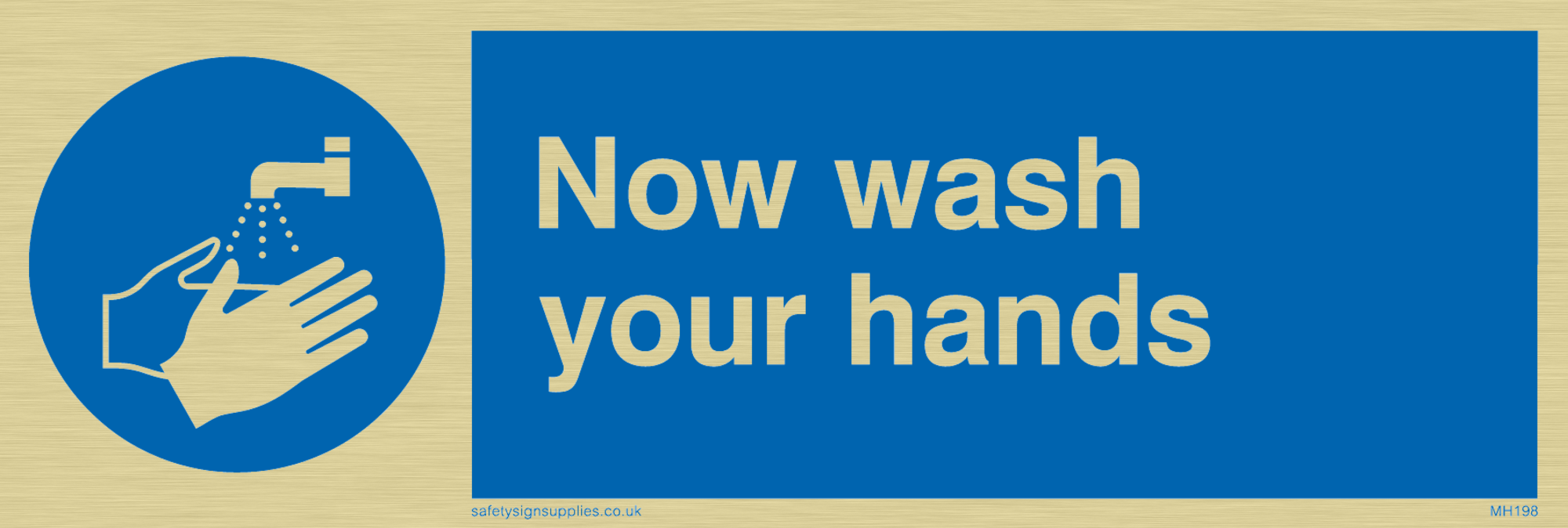 This sign contains a wash hands symbol - person washing hands under running tap in white within blue circle.