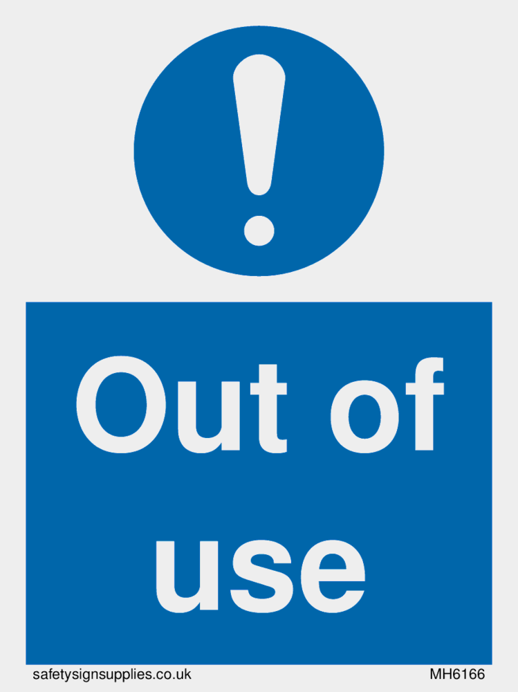 This sign contains a general Mandatory Exclamation Symbol - exclamation mark in white on blue circle background.